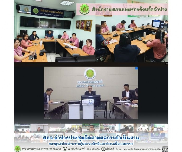 นางณิชรัศม์ แลวงค์นิล หัวหน้าสำนักงานสภาเกษตรกรจังหวัดลำปาง พร้อมด้วยเจ้าหน้าที่สำนักงานสภาเกษตรกรจังหวัดลำปางเข้าร่วมประชุมติดตามผลการดำเนินงานของศูนย์ประสานงานคุ้มครองสิทธิและช่วยเหลือเกษตรกรผ่านระบบประชุมทางไกลสื่ออิเล็กทรอนิกส์ (Zoom Meeting) โดยมีนายศรัณย์พงศ์ ฟุ้งเกียรติ รองเลขาธิการสภาเกษตรกรแห่งชาติ เป็นประธานฯ เพื่อทราบและพิจารณาในเรื่องดังนี้