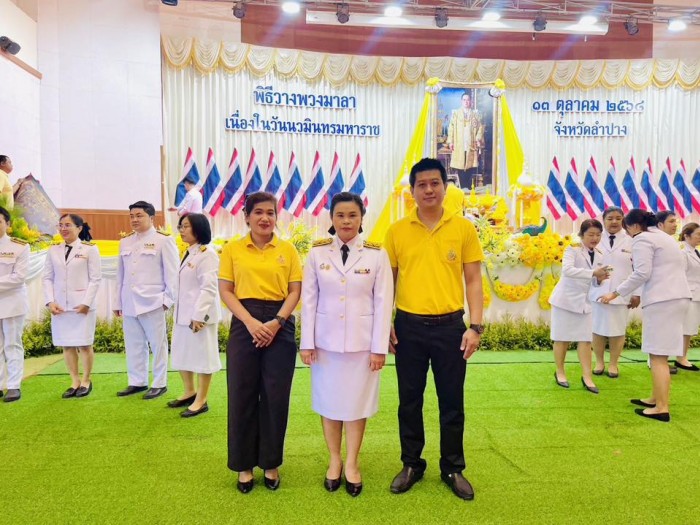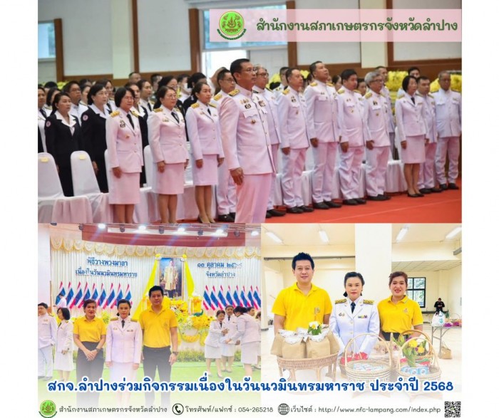 นางณิชรัศม์ แลวงค์นิล หัวหน้าสำนักงานสภาเกษตรกรจังหวัดลำปาง มอบหมายให้นางสาววรุณ ชุ่มเป็ง หัวหน้าส่วนยุทธศาสตร์การเกษตร พร้อมด้วยเจ้าหน้าที่สำนักงานสภาเกษตรกรจังหวัดลำปาง เข้าร่วมพิธีสวดพระพุทธมนต์และทำบุญตักบาตรถวายพระราชกุศล เนื่องในวันคล้ายวันสวรรคต พระบาทสมเด็จพระบรมชนกาธิเบศร มหาภูมิพลอดุลยเดชมหาราช บรมนาถบพิตร (วันนวมินทรมหาราช) ที่อาคารหอประชุมจังหวัดลำปาง โดยมีนายวิบูรณ์ แววบัณฑิต ผู้ว่าราชการจังหวัดลำปาง เป็นประธานในพิธี พร้อมด้วยคณะผู้บริหาร หัวหน้าส่วนราชการ ข้าราชการ เจ้าหน้าที่ และประชาชนชาวจังหวัดลำปางทุกหมู่เหล่า หัวหน้าส่วนราชการ ข้าราชการ ทหาร ตำรวจ และประชาชนชาวจังหวัดลำปาง เข้าร่วมพิธีอย่างพร้อมเพรียง