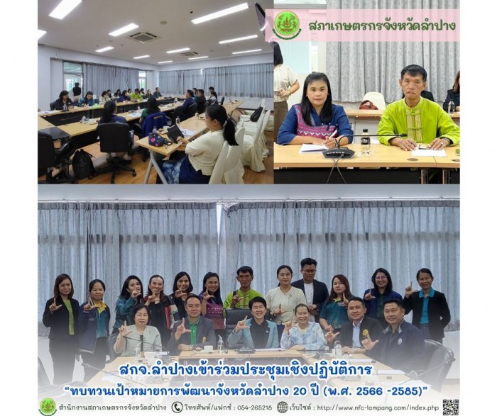 นายประพัฒน์ ปัญญาชาติรักษ์ ประธานสภาเกษตรกรจังหวัดลำปาง มอบหมายให้นายอาณัติ ฝั้นจักสาย รองประธานสภาเกษตรกรจังหวัดลำปางคนที่หนึ่ง พร้อมด้วยนางณิชรัศม์ แลวงค์นิล หัวหน้าสำนักงานสภาเกษตรกรจังหวัดลำปาง นางสาววรุณ ชุ่มเป็ง หัวหน้าส่วนยุทธศาสตร์การเกษตรและเจ้าหน้าที่ฯ เข้าร่วมประชุมเชิงปฏิบัติการ “ทบทวนเป้าหมายการพัฒนาจังหวัดลำปาง 20 ปี (พ.ศ. 2566 -2585)” เพื่อทบทวนตัวชี้วัดและค่าเป้าหมายการพัฒนาจังหวัดระยะ 20 ปีและถ่ายทอดในแต่ละช่วงระยะเวลา 5 ปี (พ.ศ. 2571 - 2575 /พ.ศ. 2576 - 2580 และ พ.ศ. 2581-2585) การกำหนดแผนที่นำทาง (Roadmap) และแผนงาน/โครงการสำคัญ เพื่อขับเคลื่อนเป้าหมายการพัฒนาจังหวัด 20 ปี โดย ดร.ขวัญนภา สุขคร และคณะ