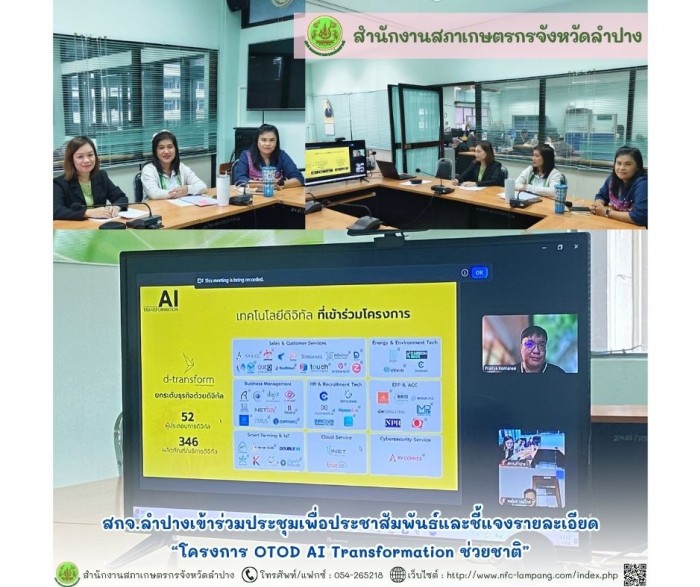 นางณิชรัศม์ แลวงค์นิล หัวหน้าสำนักงานสภาเกษตรกรจังหวัดลำปาง มอบหมายให้นางสาววรุณ ชุ่มเป็ง หัวหน้าส่วนยุทธศาสตร์การเกษตร พร้อมด้วยเจ้าหน้าที่สำนักงานสภาเกษตรกรจังหวัดลำปาง เข้าร่วมประชุมเพื่อประชาสัมพันธ์และชี้แจงรายละเอียดโครงการ OTOD AI Transformation ช่วยชาติ และตอบประเด็นข้อซักถามเกี่ยวกับโครงการ ผ่านระบบประชุมทางไกลสื่ออิเล็กทรอนิกส์ (Zoom Meeting) เพื่อชี้แจงรายละเอียดโครงการในการเข้าร่วมกิจกรรมกระตุ้นการประยุกต์ใช้บริการดิจิทัล Roadshow OTOD AI Transformation ในวันที่ 30- 31 ตุลาคม 2568 ณ สำนักงานส่งเสริมเศรษฐกิจดิจิทัล (สาขาภาคเหนือตอนบน) ที่จังหวัดเชียงใหม่ต่อไป