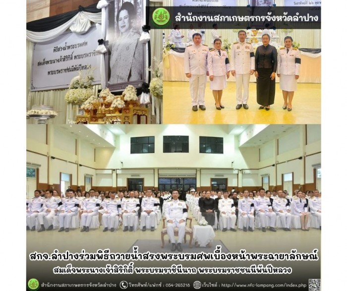 นางณิชรัศม์ แลวงค์นิล หัวหน้าสำนักงานสภาเกษตรกรจังหวัดลำปาง พร้อมด้วยนายเอกพันธุ์ จันทร์ละออ หัวหน้าฝ่ายอำนวยการ นางสาววรุณ ชุ่มเป็ง หัวหน้าฝ่ายยุทธศาสตร์การเกษตร ร่วมพิธีถวายน้ำสรงพระบรมศพเบื้องหน้าพระฉายาลักษณ์ สมเด็จพระนางเจ้าสิริกิติ์ พระบรมราชินีนาถ พระบรมราชชนนีพันปีหลวง โดยมี นายวิบูรณ์ แววบัณฑิต ผู้ว่าราชการจังหวัดลำปาง ประธานในพิธีฯ พร้อมด้วยนางสุดารัตน์ แววบัณฑิต นายกเหล่ากาชาดจังหวัดลำปาง/ประธานแม่บ้านมหาดไทยจังหวัดลำปาง คณะผู้บริหาร หัวหน้าส่วนราชการ ข้าราชการ และประชาชนชาวจังหวัดลำปาง เข้าร่วมในพิธีครั้งนี้