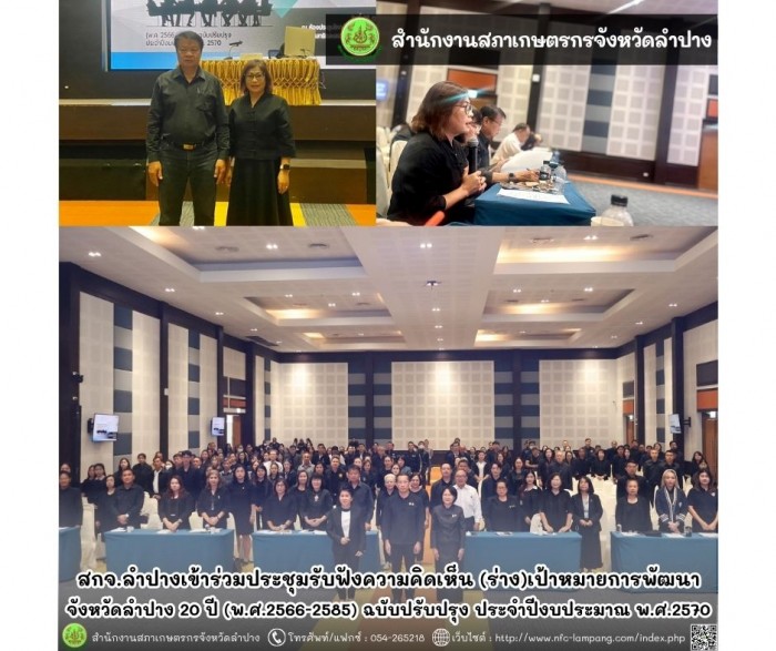 นายประพัฒน์ ปัญญาชาติรักษ์ ประธานสภาเกษตรกรจังหวัดลำปาง มอบหมายให้ นายธีรภัทร คำสม รองประธานสภาเกษตรกรจังหวัดลำปางคนที่สอง พร้อมด้วยนางณิชรัศม์ แลวงค์นิล หัวหน้าสำนักงานสภาเกษตรกรจังหวัดลำปาง เข้าร่วมประชุมรับฟังความคิดเห็นร่างเป้าหมายการพัฒนาจังหวัดลำปาง 20 ปี (พ.ศ.2566-2585) ฉบับปรับปรุง ประจำปีงบประมาณ พ.ศ. 2570 โดยมีนายนายกฤษณะ พินิจ รองผู้ว่าราชการจังหวัดลำปาง เป็นประธานการประชุมฯ ได้จัดการประชุมปรึกษาหารือร่วมกัน เพื่อรับฟังความคิดเห็นเกี่ยวกับ ร่างเป้าหมาย การพัฒนาจังหวัดลำปาง 20 ปี (พ.ศ.2566-2585) ฉบับปรับปรุง ประจำปีงบประมาณ พ.ศ. 2570 และเปิดเวทีรับฟังความคิดเห็นจากทุกภาคส่วนในพื้นที่ เพื่อให้คณะกรรมการบริหารงานจังหวัดแบบบูรณาการ (ก.บ.จ.) นำผลการปรึกษาหารือและความคิดเห็นที่ได้ไปประกอบการพิจารณาปรับปรุงแผนพัฒนาจังหวัดให้มีความสมบูรณ์ยิ่งขึ้น