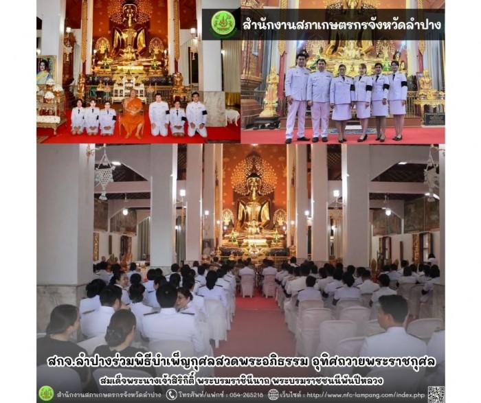 นางณิชรัศม์ แลวงค์นิล หัวหน้าสำนักงานสภาเกษตรกรจังหวัดลำปาง พร้อมด้วยเจ้าหน้าที่สำนักงานสภาเกษตรกรจังหวัดลำปาง ร่วมพิธีบำเพ็ญกุศลสวดอภิธรรม อุทิศถวายพระราชกุศลสมเด็จพระนางเจ้าสิริกิติ์ พระบรมราชินีนาถ พระบรมราชชนนีพันปีหลวง และมีข้าราชการ เจ้าหน้าที่ สังกัดกระทรวงเกษตรและสหกรณ์และประชาชนเข้าร่วมพิธีฯ โดยมีพระจินดารัตนาภรณ์ เจ้าคณะจังหวัดลำปาง เป็นประธานฝ่ายสงฆ์ และนายจิตติศักดิ์ ศรีปัญญา เกษตรและสหกรณ์จังหวัดลำปาง เป็นประธานพิธีฝ่ายฆราวาส
