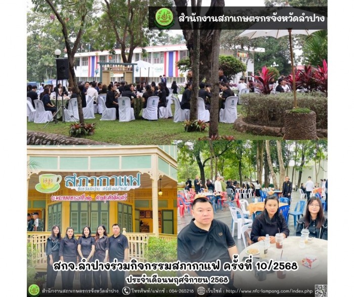 นางณิชรัศม์ แลวงค์นิล หัวหน้าสำนักงานสภาเกษตรกรจังหวัดลำปาง มอบหมายให้นางสาววรุณ ชุ่มเป็ง หัวหน้าส่วนยุทธศาสตร์การเกษตรและนายเอกพันธ์ จันทร์ละออ หัวหน้าส่วนอำนวยการ และเจ้าหน้าที่ฯ เข้าร่วมเข้าร่วมกิจกรรมสภากาแฟ ครั้งที่ 10/2568 ประจำเดือนพฤศจิกายน 2568