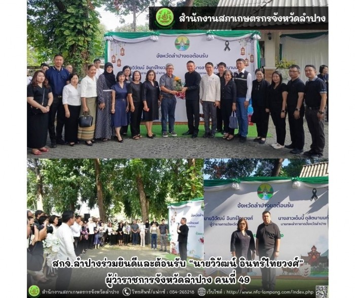 นางณิชรัศม์ แลวงค์นิลหัวหน้าสำนักงานสภาเกษตรกรจังหวัดลำปาง พร้อมด้วย นายเอกพันธ์จันทร์ละออ หัวหน้าส่วนอำนวยการ ร่วมแสดงความยินดีและต้อนรับผู้บริหารระดับสูงของจังหวัด นายวิวัฒน์ อินทร์ไทยวงศ์ ผู้ว่าราชการจังหวัดลำปาง คนที่ 49 ในโอกาสเข้ารับตำแหน่ง "พ่อเมือง" ลำปาง อย่างเป็นทางการ ณ จวนผู้ว่าราชการจังหวัดลำปาง โดยมีหัวหน้าส่วนราชการ และหัวหน้าหน่วยงานต่าง ๆ ในจังหวัดลำปางร่วมให้การต้อนรับอย่างพร้อมเพรียง เพื่อแสดงความเคารพและพร้อมให้การสนับสนุนการบริหารงานของผู้ว่าราชการจังหวัดลำปางคนใหม่