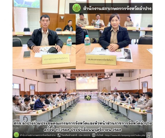 นายประพัฒน์ ปัญญาชาติรักษ์ ประธานสภาเกษตรกรจังหวัดลำปาง มอบหมายให้นายอาณัติ ฝั้นจักสาย รองประธานสภาเกษตรกรจังหวัดลำปางคนที่ 1พร้อมด้วยนางณิชรัศม์ แลวงค์นิล หัวหน้าสำนักงานสภาเกษตรกรจังหวัดลำปาง เข้าร่วมประชุมคณะกรมการจังหวัดและหัวหน้าส่วนราชการจังหวัดลำปาง ครั้งที่ 11/2568 ประจำเดือนพฤศจิกายน 2568 โดยมีนายวิวัฒน์ อินทร์ไทยวงศ์ ผู้ว่าราชการจังหวัดลำปาง เป็นประธานฯ พร้อมด้วยรองผู้ว่าราชการจังหวัดลำปาง คณะผู้บริหาร หัวหน้าส่วนราชการทุกสังกัดหน่วยงานในพื้นที่จังหวัดลำปาง และนายอำเภอทุกอำเภอ เข้าร่วมประชุมฯ ณ หอประชุมจังหวัดลำปาง