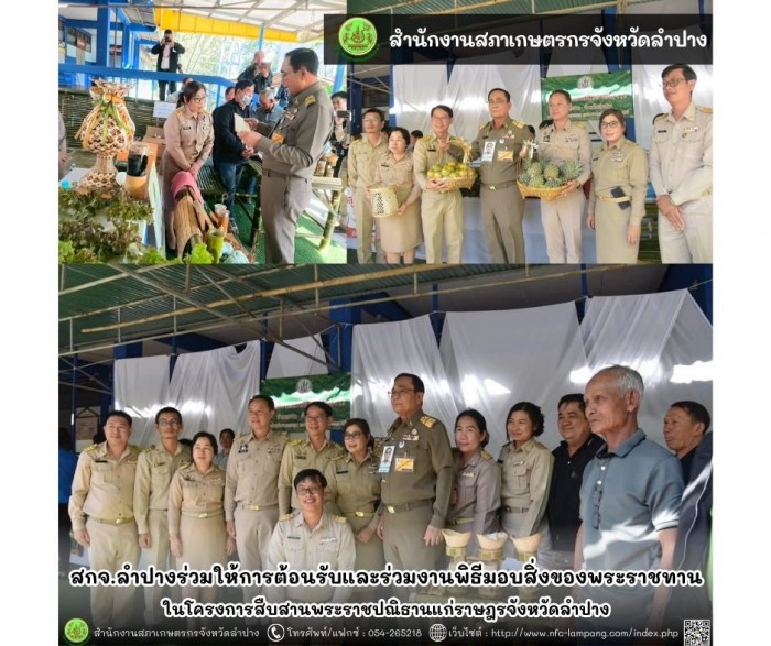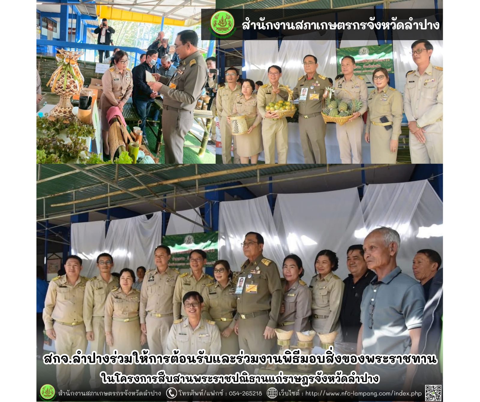 นางณิชรัศม์ แลวงค์นิล หัวหน้าสำนักงานสภาเกษตรกรจังหวัดลำปาง พร้อมด้วยนายเอกพันธุ์ จันทร์ละออ หัวหน้าส่วนอำนวยการ ร่วมให้การต้อนรับและร่วมงานพิธีมอบสิ่งของพระราชทานในโครงการสืบสานพระราชปณิธานแก่ราษฎรจังหวัดลำปาง เพื่อสืบสาน รักษา และต่อยอดพระบรมราโชบายของพระบาทสมเด็จพระบรมชนกาธิเบศร มหาภูมิพลอดุลยเดชมหาราช บรมนาถบพิตร ในการให้ความช่วยเหลือแก่ราษฎรในพื้นที่ทุรกันดาร และรับทราบปัญหาความเดือดร้อนของราษฎรเพื่อนำไปสู่การแก้ไขปัญหาและพัฒนา ตลอดจนเชิญพระราชกระแสความห่วงใยและสิ่งของพระราชทานไปมอบให้แก่ราษฎร พร้อมมอบทุนการศึกษาพระราชทาน เชิญพระบรมฉายาลักษณ์มอบแก่ผู้แทนหน่วยงานราชการ มอบหนังสือสารานุกรมไทยสำหรับเยาวชน มอบเครื่องรับสัญญาณดาวเทียมเพื่อการศึกษา มอบเก้าอี้รถเข็นสำหรับผู้ป่วยจากมหาวิทยาลัยเทคโนโลยีราชมงคลสุวรรณภูมิ และตรวจเยี่ยมการปฏิบัติงานของหน่วยงานต่าง ๆ โดยมีพลเอกประยุทธ์ จันทร์โอชา องคมนตรี เป็นประธานในพิธีฯ และนายวิวัฒน์ อินทร์ไทยวงศ์ ผู้ว่าราชการจังหวัดลำปาง พร้อมด้วยคณะผู้บริหาร หัวหน้าส่วนราชการ และประชาชนในพื้นที่ ร่วมให้การต้อนรับในครั้งนี้