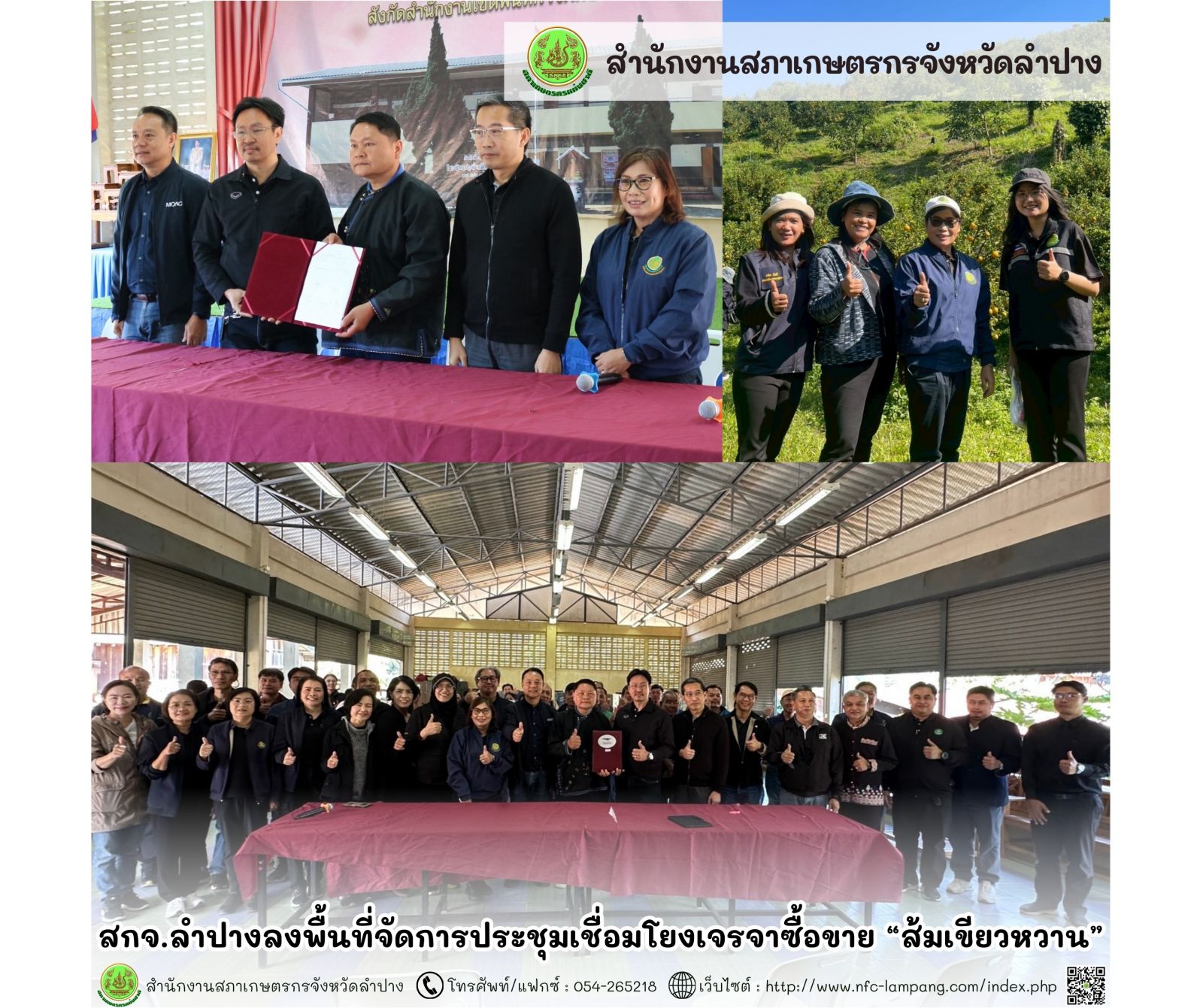 นางณิชรัศม์ แลวงค์นิล หัวหน้าสำนักงานสภาเกษตรกรจังหวัดลำปาง และเจ้าหน้าที่ฯ ลงพื้นที่จัดการประชุมเชื่อมโยงเจรจาซื้อขาย “ส้มเขียวหวาน” โดยมีนายกฤษณะ พินิจ รองผู้ว่าราชการจังหวัดลำปาง เป็นประธานฯ สำนักงานสภาเกษตรกรจังหวัดลำปางร่วมกับสำนักงานเกษตรและสหกรณ์จังหวัดลำปาง บริษัท ไปรษณีย์ไทย จำกัด พร้อมด้วยหน่วยงานในสังกัดกระทรวงเกษตรและสหกรณ์ และหน่วยงานที่เกี่ยวข้องร่วมลงพื้นที่จัดประชุมเชื่อมโยงเจรจาซื้อขาย “ส้มเขียวหวาน”